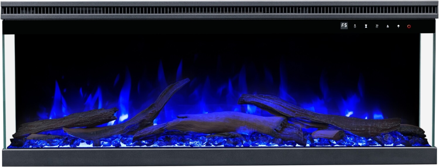 Kominek elektryczny Unique 100 PRO z włączonym efektem płomienia LED w kolorze niebieskim