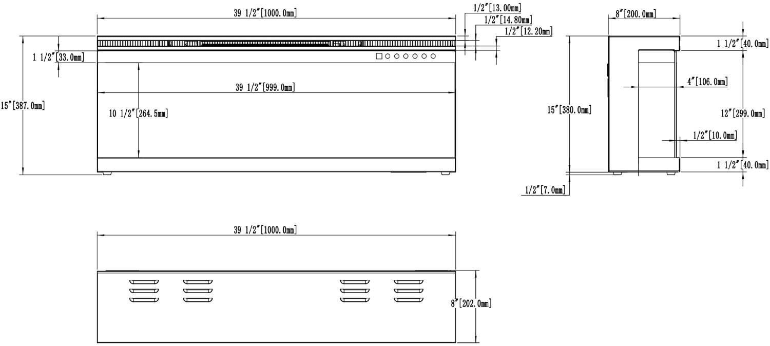 Wymiary kominka elektrycznego LED Aflamo Unique 100 Pro na schemacie rysunkowym