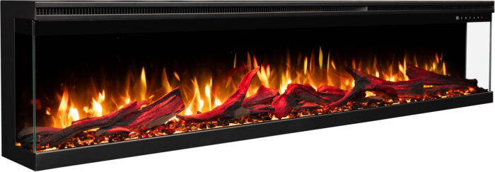 Kominek elektryczny Unique 100 PRO z bocznej perspektywy ukazujący trójstronne palenisko